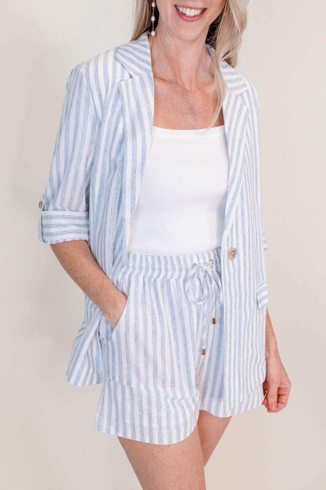 Jump into summer with our Southampton Blue Stripe Shorts. Made with a soft linen blend, these shorts feature a blue and white stripe pattern along with an elastic waist and drawstring for a comfortable fit. With front pockets and a fully lined interior, these shorts are both stylish and versatile. Complete the set with our Southampton Blazer.