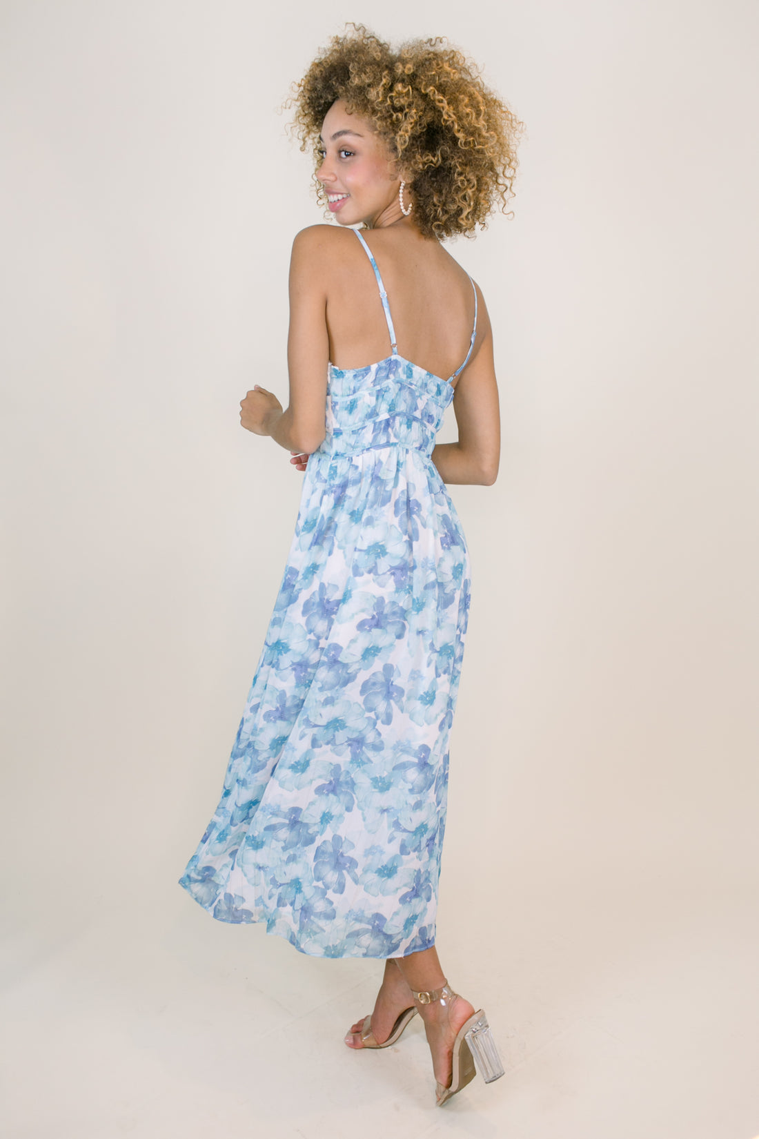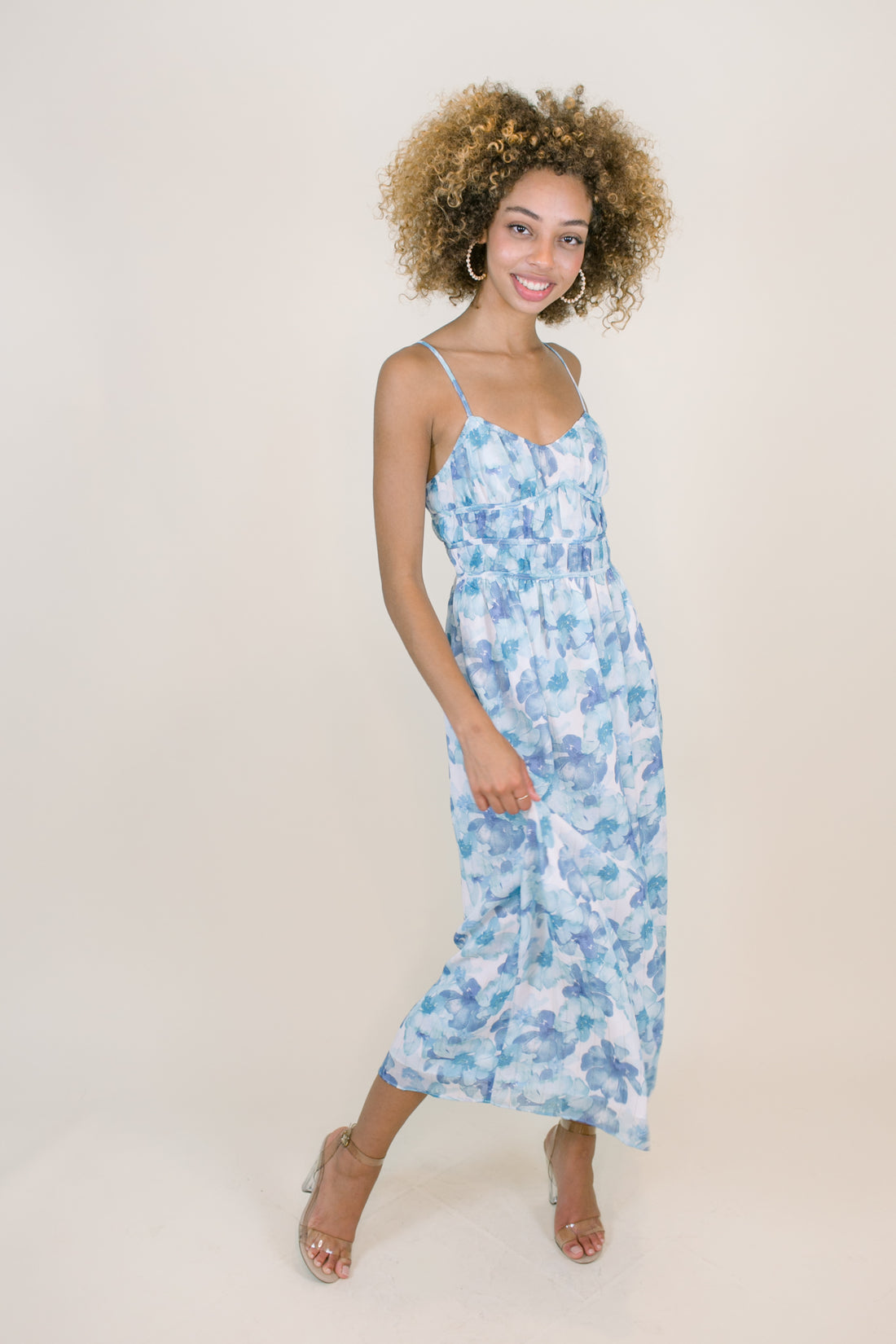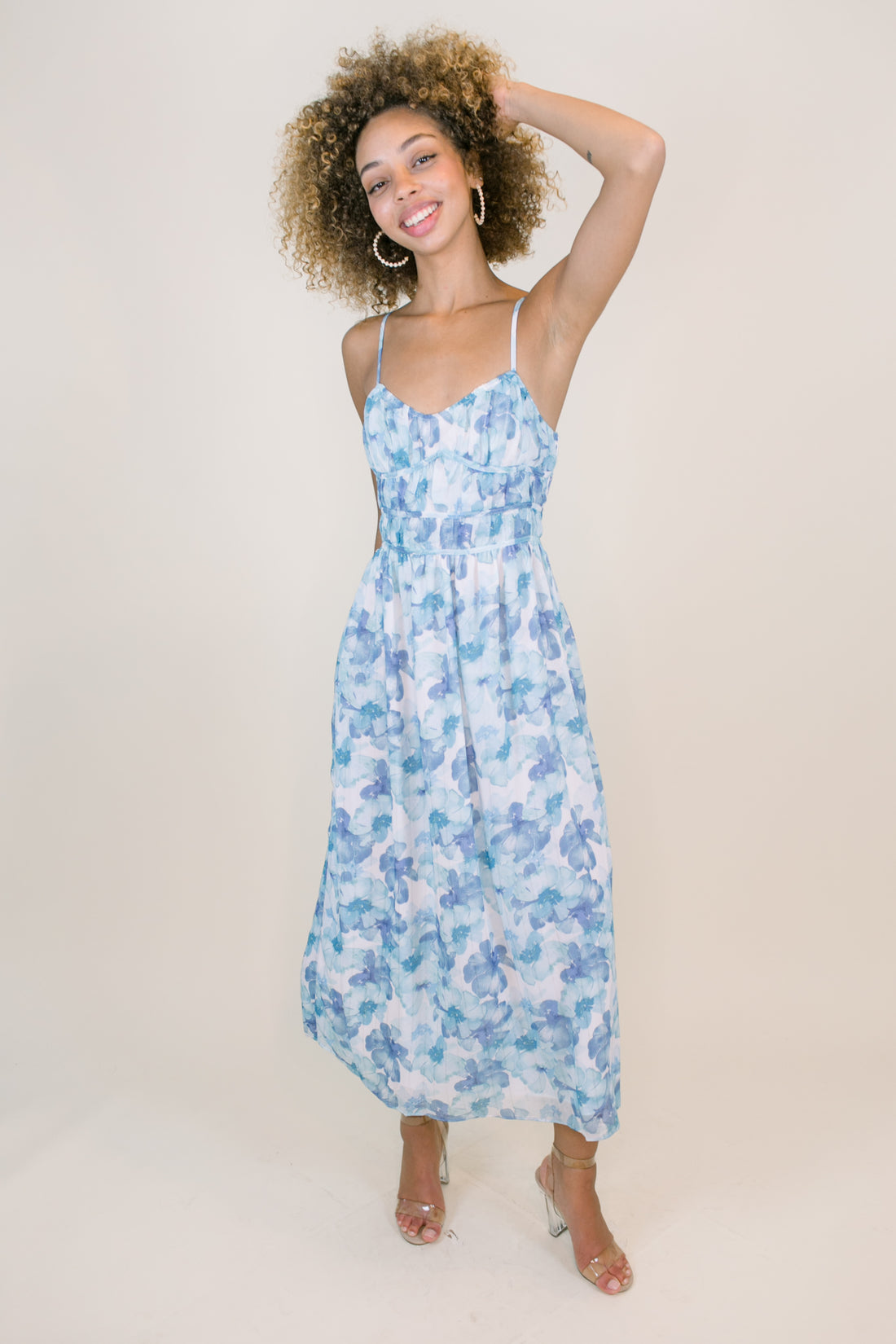 The beautiful blue floral watercolors of our Monet dress are sure to wow at your next event. Perfect your birthday party, a night out, your engagement session, family photos, or even your bridal shower for a hint of "something blue." The touch of silver tinsel woven into the fabric gives just the right amount of sparkle. Adjustable straps allow you to customize your fit. Please note, this dress runs smaller than our other styles. See the "Measurements" tab below for more info.