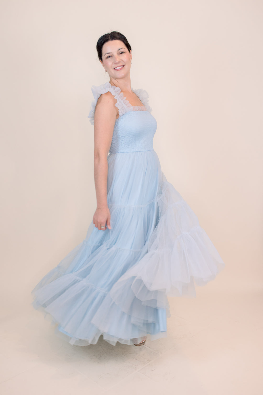 Cosette is what dreams are made of! Layers of ethereal, plush tulle drape over a fully lined skirt. The smocked top provides a flexible fit for maximum comfort, while the tulle ruffled shoulders create maximum impact. Float across the room like the princess you are, and don't forget to twirl! Perfect for holiday parties, bridal showers, engagement or family photos, baby showers, or basically any event! Honestly, I might never take this dress off!